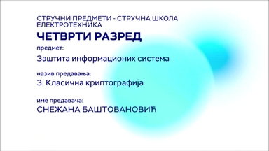 СШ4 – Заштита информационих система, 3. час: Класична криптографија Име предавача: Снежана Баштовановић