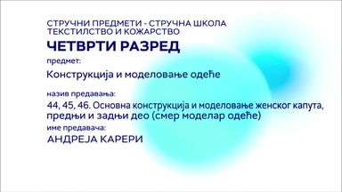 СШ4 – Конструкција и моделовање одеће, 44, 45. и 46 час: Основна конструкција и моделовање женског капута, предњи и зад. део Предавач: Андреја Карери