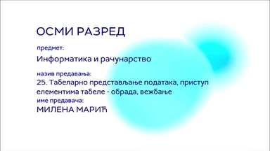 ОШ8 – Информатика и рачунарство, 25. час: Тебеларно представљање података, приступ елементима табеле (обрада, вежбање)