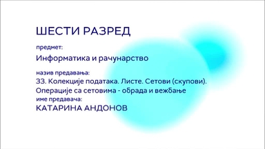 ОШ6 – Информатика и рачунарство, 33. час: Колекције података. Листе. Сетови (скупови). Операције са сетовима (обрада...)